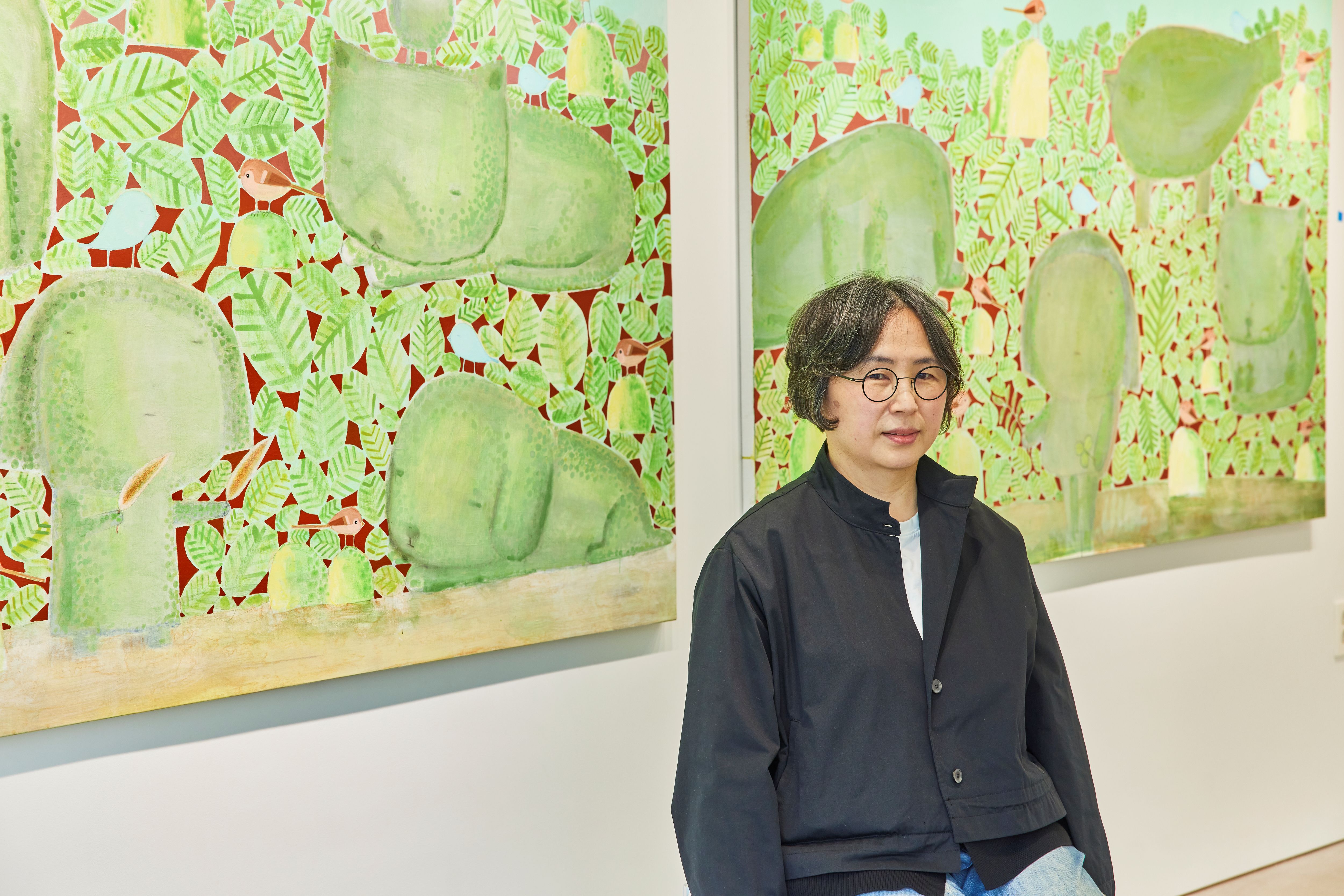 박형진의 작업은 집과 정원에서 이어지는 삶의 루틴, 가족 그리고 반려동물과 맺는 관계, 계절의 흐름 속에서 형성된 유기적 관계에서 출발한다. 매일의 감정과 미세한 감각을 일기처럼 화면에 담아내고, 물감을 입히고 건조시키며 닦아내는 행위를 겹겹이 쌓아 사적인 경험을 타인과 공유할 수 있는 감각적 언어로 전환시킨다. 확대한 식물 도상과 ‘아이’와 ‘개’의 포옹과 머묾은 시간과 내면의 리듬을 한 화면 안에 공존하게 한다. 관람객은 작품을 ‘보는’ 존재에서 그 안에 ‘머무는’ 존재로 옮겨가며, 화면 속 정원에 자신의 기억과 이야기를 포개어 읽게 된다.